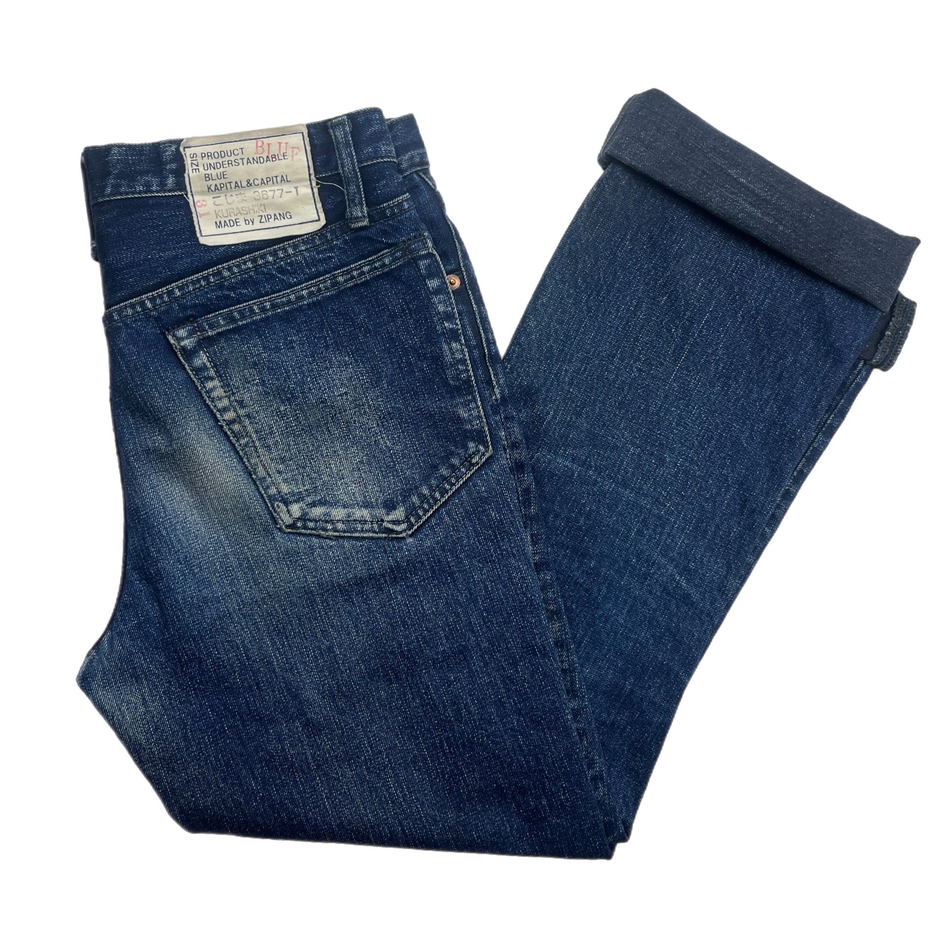 As a vintage pair of 'MADE by ZIPANG' Kapital selvedge jeans, these rare denim pants boast a unique fading on the indigo dye while also featuring a distinctive back tab and a boot cut silhouette. With a comfortable fit and a standout cut, they score a used condition of 7/10, with a small hole on the right knee.